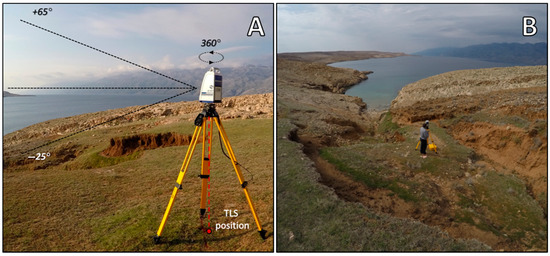 Terrestrial LiDAR scanning (TLS) has in preceding years emerged as one of the most accurate and reliable geospatial methods for creation of very-high resolution (VHR) models over complex geomorphic features [1,2,3,4,5]. TLS is an indirect measuring technique that actively emits laser beams from a terrestrial, tripod-based station while simultaneously measuring the distance to intersecting surfaces from received laser returns and forming a dense 3D point cloud [6,7,8]. Multi-temporal TLS surveys are often used for longitudinal detection and quantification of various spatio-temporal changes (STCs) caused by different geomorphic processes (e.g., landslides [9,10], rockfalls [11,12], glacial dynamics [13,14,15], coastal geomorphology [16,17,18], volcanism [19,20,21], etc.). As soil erosion represents both a rapid and complex geomorphic process and a serious environmental threat, multi-temporal TLS surveys are frequently used for detection and quantification of complex STCs induced by different sub-processes of soil erosion (e.g., rill erosion [22,23,24,25]; gully erosion [26,27,28,29,30,31], badland dynamics [1,32,33], etc.). In comparison to other direct and indirect field techniques for measurement of soil erosion intensity, TLS surveys are characterized by very high levels of accuracy and reliability, with possibility for detection of even sub-centimeter STCs [22,26,30,32,34,35]. However, complex terrain morphology and rapid erosion induced STCs of larger erosional forms, such as gullies and badlands, can lead to significant challenges in multi-temporal field TLS surveys [28]. While very complex topography can obstruct laser beams from reaching certain areas, rapid STCs can change overall morphology between two surveys, thus leading to the introduction of shadowing effects in collected point clouds [1,26,36]. Furthermore, such obstructed areas can then lead to the overall devaluation in model quality and introduction of various errors, such as underestimation or overestimation of volume of detected STCs [37,38,39]. Most of these challenges are related to the non-systematic TLS survey approach, which lacks thorough survey planning before the actual field survey [26,28,29,38]. Due to the time constraints, planning and preparation phases have been avoided or neglected in many TLS surveys, where TLS positions were determined on site, based entirely on user experience and judgment. Such a non-systematic TLS survey approach is especially problematic in the case of multi-temporal surveys, which should be as accurate, identical and repeatable as possible [25].