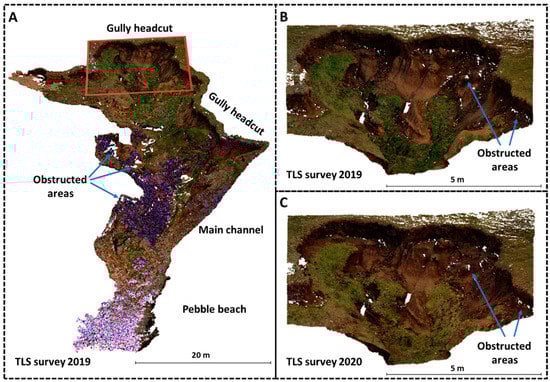 Point clouds created from carried out multi-temporal TLS surveys ((A)—point cloud of whole gully (SA-1) (Parts of point cloud for SA-1 with purple texture were collected after the twilight, which caused errors in stored texture information); (B,C) point clouds of chosen part of gully headcut (SA-2) used for detection and quantification of STCs).