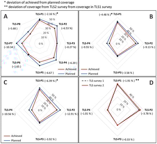 Deviation of planned and achieved coverage for every individual TLS position ((A)—Deviation of initial TLS survey of whole gully Santiš (SA-1); (B)—Deviation of initial TLS survey of gully headcut (SA-2); (C)—Deviation of second TLS survey of gully headcut (SA-2)) and difference in achieved coverage of gully headcut (SA-2) between TLS survey 2019 and TLS survey 2020 (D).