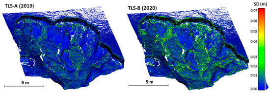 Comparison between the standard deviation of two multi-temporal point clouds (initial TLS survey (left) and final TLS survey (right)).