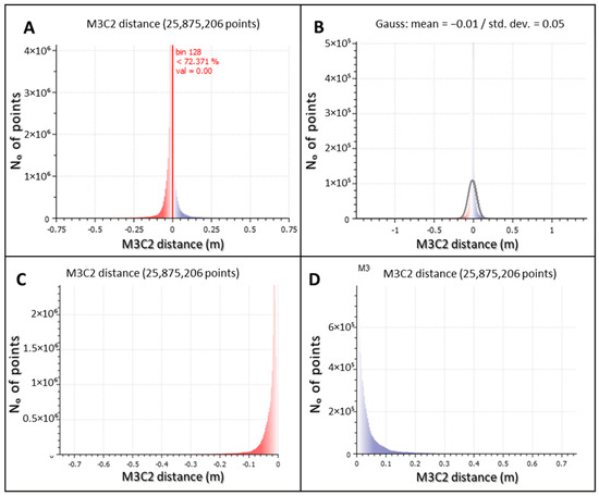 Histogram of all STCs detected by M3C2 algorithm (A); Gaussian distribution of all STCs detected by M3C2 algorithm (B); negative STCs (erosion) detected by M3C2 algorithm (C); positive STCs (accumulation) detected by M3C2 algorithm (D).