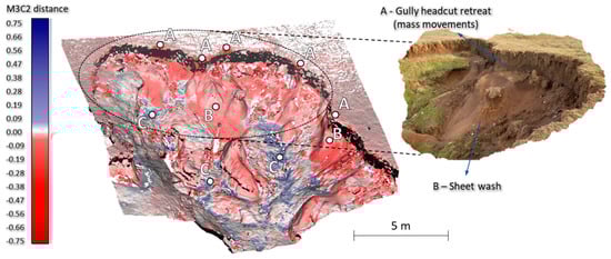 Detection of soil erosion induced STCs was performed within the CloudCompare software (v2.6.1.), using the Multiscale Model to Model Cloud Comparison (M3C2) algorithm. The M3C2 algorithm was already successfully applied for point cloud-based detection of STCs caused by various geomorphic processes, such as river dynamics [50], soil erosion [27,51,52,53], rockfalls [12,54], rock glaciers [54,55,56], etc. Since the M3C2 algorithm is a point cloud-based method, it allows detection of complex (3D) soil erosion induced STCs, thus successfully overcoming the shortcomings of DEMs of difference (DoDs) related to the complex morphology of erosional forms [51,52,57]. As DoD represents a 2.5D model, significant errors can occur during the detection of STCs, especially in complex steep and overhanging parts of the terrain where 2.5D models cannot accurately represent the terrain morphology [50,58,59,60].