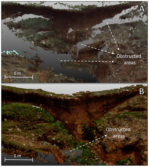 In total, the initial TLS survey covered 1181.07 m2 of SA-1 (96.26% of the total study area), which deviates from planned coverage for only 8.97 m2, or 0.73% (Table 2). The highest concentration of obstructed areas was in the middle part of the gully, within the deeply incised sub-channels of the main gully channel (Figure 9B).