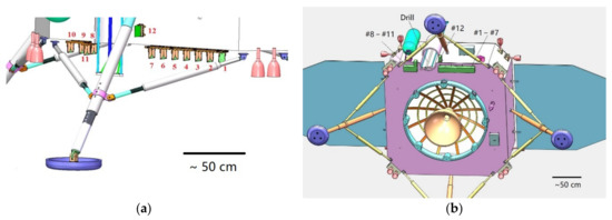 Schematic diagram of the antenna array from a side view (a) and a bottom view (b). Antennas #1 to #10 are aligned along one edge of the lander’s bottom, with the drill mounted between antennas #7 and #8. Antennas #11 and #12 are mounted separately. The longest dimension of the antenna array is 1.518 m.