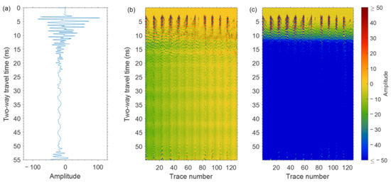 where and are the i-th waveforms of observation data before and after trace balancing, respectively, is the amplitude correction factor for each trace defined as , where is the average amplitude of each trace calculated by . is the average amplitude of all traces calculated by , where is the total trace number. Figure 4b,c show the radargram and the wiggle form of the observation data after processing.