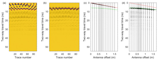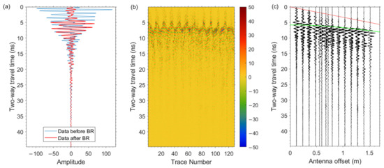 where i is the trace number, is the shifting time for observation data, is the two-way travel time, is the time range for correlation calculation (smaller than the arrival time of ground-reflected waves), and are waveforms of observation data and background, respectively, is the trial shifting time, and is the sampling interval. Figure 4a compares the waveforms of a single trace before and after background removal. Data after 45 ns in each trace are abandoned to avoid the reflection signals from the cable-antenna interface. As the travel distance increases with antenna offset, the energy of traces become weaker. According to Feng and Sato [18], to balance the energy of each trace, we correct the amplitude of each trace by:
