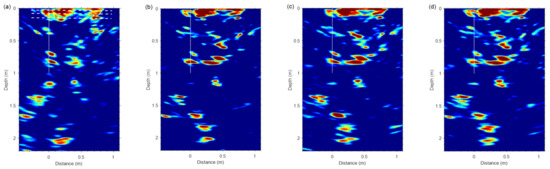 (a) Imaging result of the pre-drilling data. (b–d) Imaging results of the other three post-drilling data. The vertical dotted lines in these images indicate the drilling trajectory of the drill. The horizontal dashed lines in Figure 5a show the position of ground reflection. The background with low intensity represents lunar soil with uniform density, while high intensity in these figures indicates strong radar echoes from buried objects denser than lunar soil. The three post-drilling imaging results are almost identical. There is a little difference between the pre-drilling and post-drilling results.