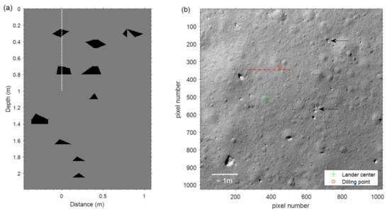 Figure 6a illustrates the structure diagram of regolith at the CE-5 drilling site based on our interpretation of the LRPR imaging results. It represents a cross-section of regolith along the red dashed line shown in Figure 6b. There is no continuous layer or bedrock–regolith interface within the LRPR’s detection range, implying that the regolith thickness is larger than 2 m. The local regolith consists of fine-grained material with some rocky regions of decimeters in size. This is consistent with the rock distribution on the surface captured by LCAM. As shown in Figure 6b, rocks of decimeters in size and aggregate fragments (indicated by black arrows) are just several meters away from the drilling site. The landscape photographed by the lander’s panoramic camera also illustrates that the lunar surface near the landing site is strewn with many small rocks (Figure 7). According to Liang et al. [16], the drilling and coring process was terminated at 1 m, possibly because a rock fragment obstructed the drill bit or internal coring mechanism. Zheng et al. [1] state that most of the Chang’E-5 drill samples were derived from 0 to 73.8 cm below the lunar surface, and few samples were extracted below 73.8 cm, as the drilling encountered several rocky regions. Therefore, we speculate that the drill penetrated two rocky regions (probably aggregate fragments) in the regolith, and a rock fragment from the deeper region obstructed the drill.