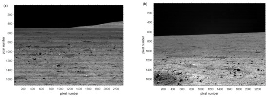 where and are trace numbers, and are real parts of the analytical signals in trace and at , while and are the imaginary parts of the analytical signals. and are weighting functions for echoes in trace and . The weighting function is determined by the signal travel distance and the attenuation coefficient. The travel time is a function of the subsurface point’s coordinates , signal propagation geometry, and antennas’ coordinates in trace . Snell’s law is employed to calculate the signal propagation geometry and travel time for each scattering point. Since LRPR is not a traditional movable common-offset GPR, there is no hyperbola in its radargram, and we cannot use the hyperbola fitting method to estimate the travel velocity. According to the laboratory measurements of the CE-5 lunar samples, the average permittivity and loss tangent of the regolith at 1–3 GHz at the landing site are 3.04 ± 0.02 and 0.014 ± 0.002 [4]. We use these measured values to calculate the propagation velocity and attenuation coefficient of the radar signal in the regolith. Details of the imaging method can be found in Feng et al. [21].