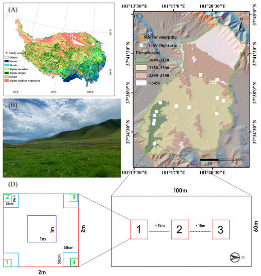 (A) Location of the study area on the Qinghai–Tibet Plateau; (B) photo of the study area; (C) study area with the location of used UAV flight sites; and (D) sampling design for each site in which the red boxes denote the three 2 m × 2 m sampling plots, and the green (25 cm × 25 cm), blue (50 cm × 50 cm) and purple (1 m × 1 m) boxes denote the quadrats for biomass harvesting, UAV spectra extraction and species survey, respectively, in each plot. Aboveground biomass in the subplots 1, 2 and 3; 2, 3 and 4; and 1, 3 and 4 for plots 1, 2 and 3, respectively, were harvested after the spectral measurements.