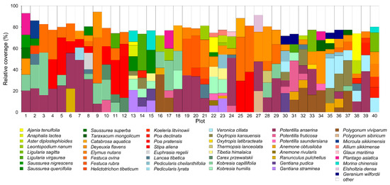 The sampled species composition and relative coverage in the 1 m × 1 m area (corresponding to the purple boxes in Figure 1D) in each plot used in this study.