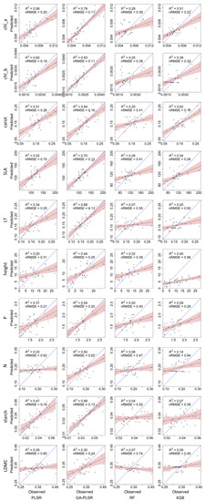 Predicted versus observed chlorophyll a (chl_a), chlorophyll b (chl_b), carotenoid (carot), specific leaf area (SLA), leaf thickness (LT), plant height (height), phosphorus content (P), starch content (starch), leaf dry matter content (LDMC) and nitrogen content (N) from PLSR, GA-PLSR, RF and XGBoost; the blue line denotes the 1:1 line, and the red areas denote the 95% confidence interval.