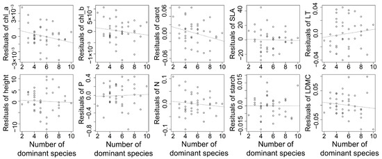 In addition, we analyzed the relationships between the predicted residuals of plant community traits and the number of dominant species in each plot. It showed that there was no statistically significant relationship (p > 0.05) between the predicted residuals of traits and the number of species (Figure 5).