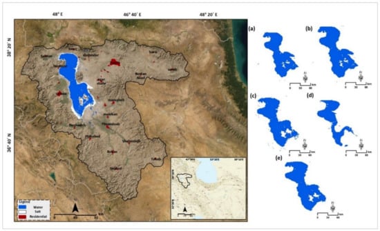 ULB location (left), and the Urmia Lake levels (right) in (a) 2000, (b) 2005, (c) 2010, (d) 2015, and (e) 2020.