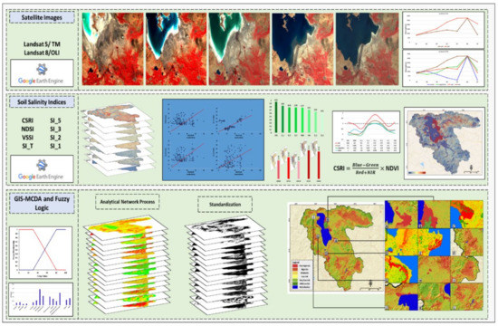 It is critical to determine the extent of saline soil and track changes in salinity to develop appropriate and timely management plans for such soils. The integrated approach of remote sensing and GIS (also referred to as geoinformation) is an effective method for soil salinity monitoring and degradation mapping (SMDM) and environmental analysis. Such an integrated approach of remote sensing and GIS provides a baseline for SMDM and developing scenario-based prediction models, especially for fragile environments such as dying lakes [33]. It is widely acknowledged that remote sensing is one of the most efficient methods for monitoring and mapping soil salinization and degradation by recognizing the various sizes, shapes, and occurrences of erosional features across large areas [33]. In this integrated approach, remote sensing image processing techniques enable us to detect and monitor the extent of soil salinization and associated environmental issues. The GIS-based spatial analysis also allows us to determine the criteria impacting soil salinity and degradation, process them, and develop a variety of soil degradation maps (e.g., soil erosion and salinity risk maps). This allows us to observe and monitor the soil salinity trend of recent years and identify and predict potential areas facing salinity risk now and in the future.