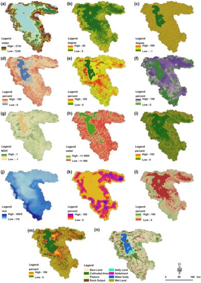 Standardized soil degradation map showing: (a) elevation; (b) slope degree; (c) slope aspect; (d) curvature; (e) soil depth; (f) soil texture; (g) vegetation density; (h) distance from river; (i) Stream Power Index; (j) annual precipitation; (k) drainage density; (l) slope length; (m) topographic wetness index; and (n) LULC.