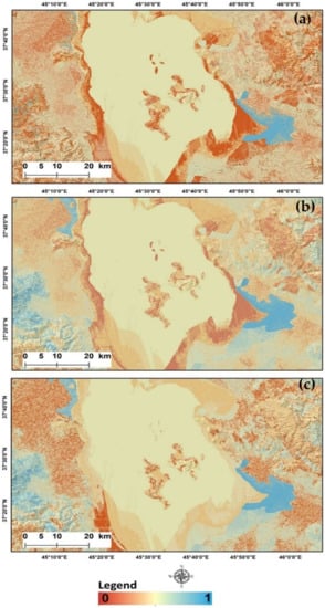 Soil degradation is considered a serious global issue that impacts global food security and the environment [23,24]. Climate change significantly contributes to soil degradation. Reduced water availability in irrigated agricultural zones, upward movement of salts from shallow water tables, reuse of degraded waters, and salt-water intrusion can all contribute to soil salinity development in the root zone [25,26]. One of the most tangible environmental impacts of climate change and associated issues on soil degradation and, in particular, soil salinization can be observed in global dying lake environments [27,28,29]. We can observe the detrimental effects of climate change, including soil salinity and degradation, on the natural environment of the dying, hyper-saline Urmia Lake. The severity of the Urmia Lake drought is intensified by other subsidiary influences of climate change, such as the rapid depletion of groundwater, decreasing groundwater quality, soil salinization, loss of soil fertility and intensive soil degradation [29,30]. The environmental issues caused by this lake drought are expected to be powerful enough to cause potential future migration and human displacement of susceptible rural communities from affected areas to other regions of the country [31,32]. Due to its increasingly critical condition, the United Nations Environment Program (UNEP) declared Urmia Lake’s status as “worrying” in its Global Environmental Alert Service Bulletin in February 2012. The Urmia Lake drought significantly impacts the quality of the area’s soils through extensive soil salinization and degradation. Monitoring the saline areas is essential to controlling the degradation, especially in arid and semi-arid areas, such as Urmia Lake Basin.