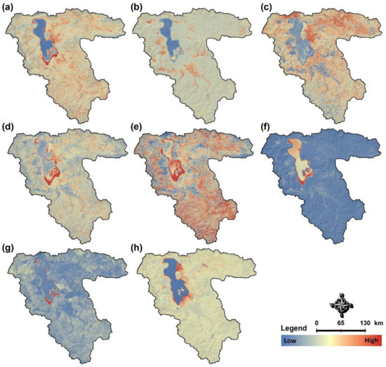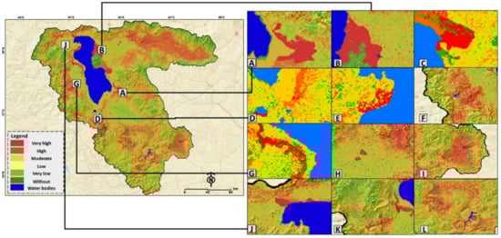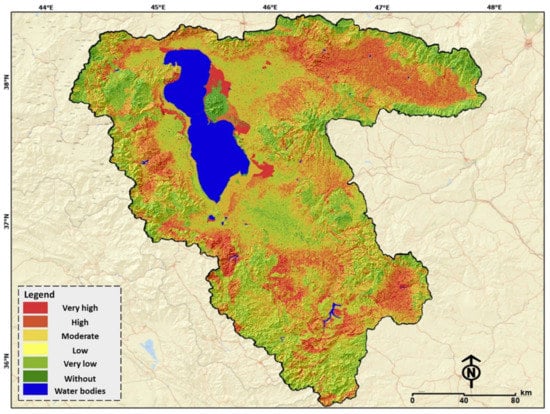 The DEM was also used to compute the hydrology datasets of stream power index (SPI) and topographic wetness index (TWI). The SPI is estimated along the stream network to assess the change in magnitude of stream power between pre- and post-development scenarios [42]. Basically, TWI defines the effect of topography on the location and size of saturated source areas of runoff generation [43,44]. The parameter TWI has been significantly investigated for soil degradation mapping and constitutes one of the most commonly used conditioning factors [44]. The soil type, depth, and erodibility were obtained from pedology maps at a scale of 1:50,000. For the rainfall map, initial data were obtained from meteorological stations in the ULB, and the final map was computed using spatial interpolation techniques. The normalized difference vegetation index (NDVI) was derived from the Landsat satellite images. NDVI is known as an efficient index for density of vegetation covers. The land use/cover (LULC) map was derived from the Landsat satellite images obtained as part of our earlier research on monitoring the LULC changes in the ULB from 1990–2020 using an integrated approach of object-based image analysis and deep learning techniques [31,38,39]. We used 150 ground control data points and their respective laboratory analysis to validate the results. These data points and samples were obtained during fieldwork in 2020 and supplemented with historical soil salinity data from the Organization of Agriculture and Natural Resources (OANR, 2020). All data were collected in the coordinate system of Universal Transverse Mercator Zone 38 N, World Geodetic System 1984. As Table 2 shows these data we obtained from different resources. Thus, all data preparation (e.g., extraction, editing, reformation, distance computation, etc.), and standardization were carried out in Arc GIS environment.