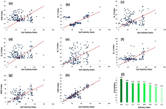 Validation results of the correlation between the soil salinity indices (see Figure 6) and the soil salinity data obtained in the laboratory for the ground control points (see Table 4). The computed correlations show the results for soil salinity indices: (a) VSSI; (b) SI_T; (c) SI_5; (d) SI_3; (e) SI_2; (f) SI_1; (g) NDSI; (h) CSRI; and (I) comparing the accuracy of all indices. The CSRI achieved the highest accuracy.