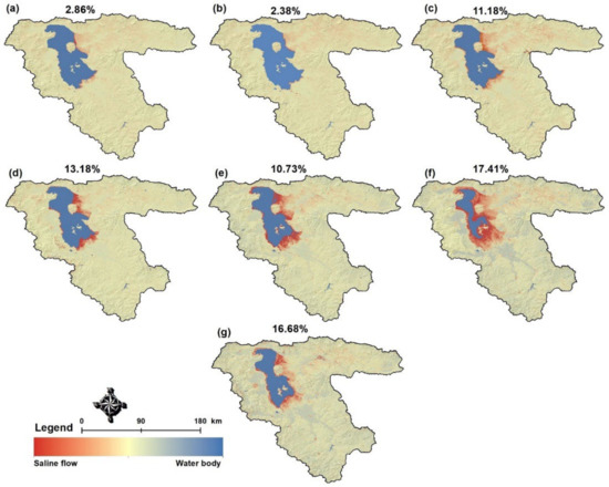 Soil salinity based on the CSRI index in: (a) 1990; (b) 1995; (c) 2000; (d) 2005; (e) 2010; (f) 2015; and (g) 2020. As can be seen on the maps, the soil salinity (red areas) has increased significantly from 1990 to 2020.
