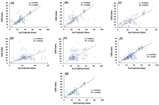 Validation results of CSRI index (see Figure 8) based on the ground control sample points obtained during field work and based on the historical soil salinity dataset (see Table 4). The charts indicate that valid soil salinity maps have been developed for: (a) 1990, (b) 1995, (c) 2000, (d) 2005, (e) 2010, (f) 2015, and (g) 2020.