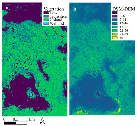 (a) Vegetation classification of the Yaxnohcah study site over a Sentinel-2 satellite image. (b) Tree heights obtained from the difference between the Digital Surface Model and the Digital Elevation Model from lidar data.