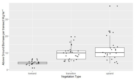 The allometric equation selected AGB est = 0.0673 × (ρD2H)0.976 [23] is based on diameter, height, and wood density, and gave us a general value of 179.01 Mg/ha for field data. However, there is variability in forest AGB within the three vegetation types (Figure 5). AGB ranged from 80 Mg/ha in low forest to 197 Mg/ha in transitional forest and 241 Mg/ha in upland forest (Table 1). For the lowland we additionally measured trees in 13 transects with a <6 cm D in plots of 25 m2 at the beginning of the main transects. The small trees add an average of 14.5 Mg/ha to the AGB. In the total 3.65 ha surveyed, the species with higher AGB Mg/ha were Manilkara zapota (L.) P.Royen (34.9), Brosimum alicastrum Sw. (24.6), Pouteria reticulata (Engl.) Eyma (19.41), and Bucida buceras L. (10.69). To obtain Aboveground Carbon (AGC), we used 0.471 as AGB’s ratio, obtaining 38 Mg/ha in lowland forest, 93 Mg/ha in transition forest, and 113 Mg/ha in upland forest.