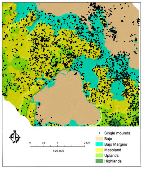 We used the settlement location provided from archaeological survey records to compare with the vegetation distribution in the landscape. We determined that settlements spread over an area of 2410.5 ha and cover an area of 50.5 ha. According to the vegetation distribution map, they are located to a greater extent in the current upland forest (62.1%) rather than in transitional forest (26.7%) or lowland forest (10.9%) (Figure 7). The settlements located in lowland vegetation are in smaller bajos (also known as “pocket bajos”), rather than in larger bajos that are seasonally inundated areas. Due to the different criteria of subdivisions of the topographic zones, the results are slightly different from the vegetation allocation (Table 3). Although, they concur in allocating the highest percentage of mound frequency in the mesoland and upland topographic zones (65.6%) (Figure 8).