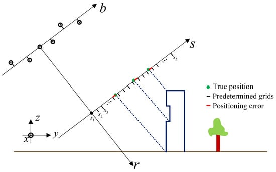 The conventional TomoSAR inversion methods mentioned above are considered on-grid methods using a discretized TomoSAR model, because they assume scatterers are located exactly on predetermined finite fixed grids. Therefore, the elevation is discretized into L grids beforehand, , and scatterer positions are obtained on one of the L grids. However, the physical truth does not always conform to the above assumption, and scatterers in the azimuth-range pixel may lie on any position of the unambiguous elevation. Therefore, the discretized TomoSAR model will inevitably lead to location bias or detection errors owing to discretization, which is called the off-grid effect or basis mismatch [13] in CS theory. Figure 1 shows the off-grid effect in the TomoSAR elevation direction. The blue line represents a building, and we give three examples of scatterers on the building that may generate strong scattering. The elevation direction s is divided into grids. The green points are the real positions of scatterers. However, since true positions are not exactly located on the grids, the grids adjacent to true positions will be used as the result of estimated locations. Thus, there is a positioning error between the true and estimated positions of scatterers, shown by the red line in Figure 1. By increasing the number of grids and reducing the space between grids, the off-grid effect can be alleviated to some extent. However, a sampling grid that is too dense increases computation dramatically and results in a high coherence dictionary, which does not meet the incoherent property in CS theory and degrades the recovery performance [14]. For TomoSAR, the off-grid effect is also a common problem. Considering the complicated backscattering properties between the buildings and surroundings in urban areas, the estimated building heights can be inaccurate because of the discretization of elevation in the TomoSAR model.