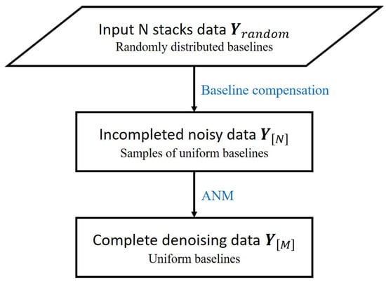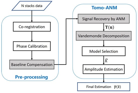 To invert the TomoSAR model in Equation (6), we propose a TomoSAR algorithm based on ANM, which we refer to as Tomo-ANM for convenience. The flowchart is shown in Figure 2. In the preprocessing stage, apart from the co-registration and phase calibration step, the baseline compensation step compensates randomly distributed baselines as uniform baselines or samples of uniform baselines, which is a necessary condition for using an ANM algorithm. In the TomoSAR inversion stage, the complete denoising signal is first recovered by ANM. Vandemonde decomposition is used to obtain the possible position of scatterers. We then estimate the model order—the number of scatterers—within one pixel. Finally, amplitudes of scatterers need to be reestimated by the linear inversion algorithm.