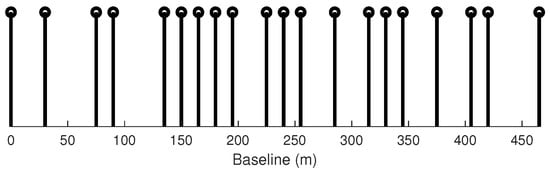 The wavelength and slant range were set to 0.031 m and 588,303.75 m, respectively, which are equal to the parameters used in Section 4. We chose 20 samples from 32 full uniform data, with baselines shown in Figure 4. The minimum baseline is 15 m, while the maximum is 465 m. From that, the Rayleigh resolution and unambiguous height can be obtained: