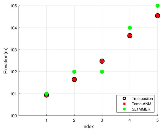 First, the removal of the off-grid effect by the Tomo-ANM algorithm is shown in Figure 5. We provide the detection results of five scatterers along the elevation direction. The black circles represent true locations, the red boxes denote the Tomo-ANM results, and the green dots show the SL1MMER detection results. Five scatterers are randomly distributed between 100 m and 105 m. The SL1MMER algorithm sets the grid interval as 1 m, and the estimation results are located at grids adjacent to the truth positions, thus producing a positioning error. Regardless of noise, Tomo-ANM can accurately obtain the scatterer positions and eliminate the off-grid effect completely. The validity of Tomo-ANM was preliminarily illustrated. Four experiments were then implemented.