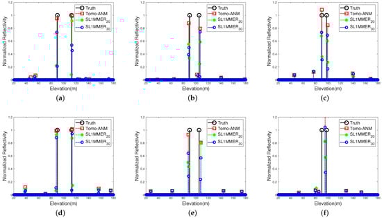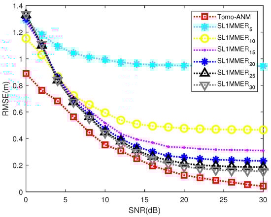 Location Accuracy: The location accuracy of one scatterer of Tomo-ANM and SL1MMER was investigated. The SNR was set to 0:2:30 dB, and the grid density of SL1MMER was set to = 5:5:30. The elevation of the scatterer was randomly distributed in , and the amplitude and phase were fixed. For each parameter setting, 1000 Monte Carlo experiments were performed. The RMSE (root mean square error) was used to measure accuracy. Results are shown in Figure 7. The accuracy of SL1MMER improves as grid density increases. For example, the RMSE falls from to m when the number of grids increases from 5 M to 30 M for dB. This proves that the off-grid effect can be alleviated to some extent in this way. The RMSE decreases quickly (from to m using ) when the SNR changes from 0 to 20 dB, but nearly remains unchanged (from to m using ) when the SNR is higher than 20 dB. This is because, when the SNR is good enough, the performance of SL1MMER is mainly constrained by all grids. When it comes to Tomo-ANM, the RMSE is always lower than SL1MMER under any SNR, and the difference reaches a minimum of m using when the SNR is 16 dB. It then degrades slowly, even when the SNR exceeds 20 dB. This demonstrates that Tomo-ANM has nothing to do with grids and can obtain more accurate results than SL1MMER.
