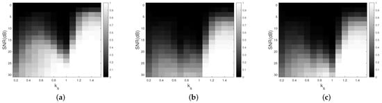 As mentioned in Section 2.2, IVDST is an iterative and shrinkage-thresholding algorithm. Three parameters need to be set before iterations [24]. They are stepsize , shrinkage-threshold , and stopping criterion . The parameter setting of the system is the same as Section 3. Three hundred Monte Carlo experiments are implemented for each parameter setting, and the maximum number of iterations was set to 30.