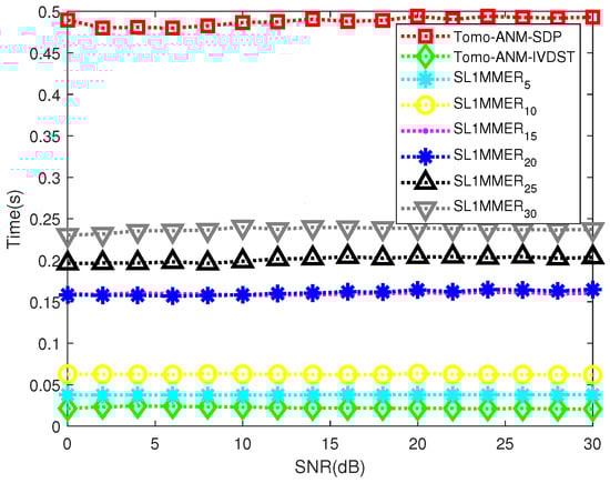 As stated in Section 1, ADMM is a mature algorithm widely used in SDP acceleration [22,23,31,32]. In this section, we made a simple comparison of two fast implementations of ANM, IVDST, and ADMM. The parameter settings were the same as those in Section 3. Results are shown in Figure 17.