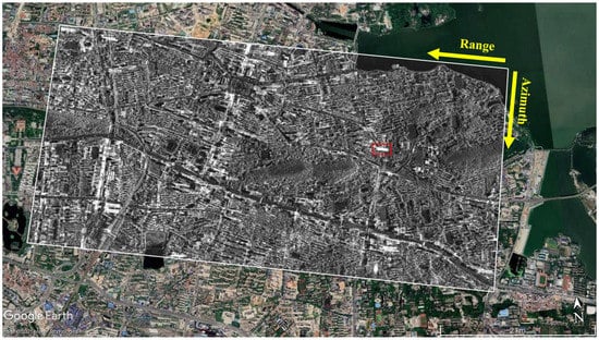 Display of the TerraSAR-X data. SAR image in the white box overlaid on Google Earth optical image. Range and azimuth direction are indicated by yellow arrows. The high-rise building marked by a red rectangle is investigated next.