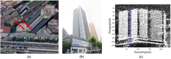 We used images of Hubei Science and Technology Venture Building, labeled by the red box in Figure 10, to conduct the following real data experiments. Viewed from the top, the Hubei Science and Technology Venture Building is a hexagonal building, as shown in Figure 11. According to the relationship between the SAR incident direction and the building orientation, it is obvious in Figure 11a that two surfaces can be illuminated and imaged on the slant-range plane of SAR. Figure 11b is a street-view photo of Hubei Science and Technology Venture Building from Baidu Map. There are many glass windows distributed on the two illuminated surfaces of the building. At an appropriate SAR incident angle, the glasses could form strong backscattering, while the backscattering of the connected wall is relatively weak, thus forming four bright glass walls and three dark gaps in the SAR image, shown in Figure 11c.