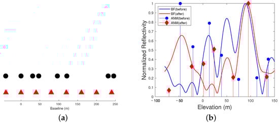 In actual airborne or spaceborne cases, the N stacks TomoSAR data are usually acquired by repeat passes. Thus, the baselines are inevitably randomly distributed. The baseline compensation step compensates as , which is the input of the ANM algorithm.