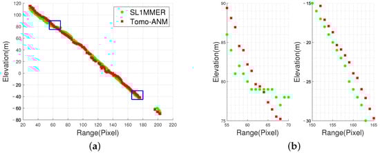 By comparing the two tomographic profiles shown in Figure 13, due to the off-grid effect, the on-grid TomoSAR inversion–SL1MMER profiles are influenced by the grids, while the Tomo-ANM profiles, using continuous dictionary, eliminate the off-grid effect completely and can better position the scatterers.
