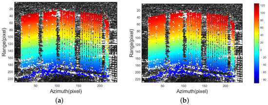 To demonstrate the validity and potential of the Tomo-ANM method for urban area analysis, we implemented tomographic inversion on the whole test building in Figure 11c. Figure 14 shows the reconstruction results overlaid on an amplitude image, with different colors representing elevation values. Note that the elevation value shown is at an elevation direction perpendicular to the azimuth-range plane and does not transform from the elevation coordinate to the height coordinate perpendicular to the ground. By comparing Figure 14a,b intuitively, it is obvious that both algorithms can recover the general elevation change of the building, and the elevation trend is correct.