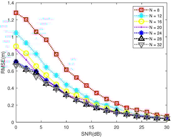 Figure 15 displays the change in RMSE with the SNR under different sample numbers N. The accuracy of Tomo-ANM under every N increases with the increase in SNR. This is consistent with the conclusion in Section 3. With the increase in the sampling rate, the positioning increases in accuracy. The RMSE decreases from to 0.67 m, while N changes from 8 to 32 with SNR set to 0 dB. When N is greater than 20, the positioning accuracies are very close to each other. Even at , the positioning accuracy with a good SNR, 0.07 m at 30 dB, is very competitive. Figure 16 shows the performance of the detection rate of the two scatterers under different N and SNR values. The horizontal axis is the normalized distance, and the vertical axis is the detection rate. The performance under three SNRs (10 dB, 20 dB, 30 dB) is presented by different line types, respectively, in Figure 16a–c, and the performance of different sample numbers N was studied under each SNR. There is still a drop around . When N is fixed at 8 and , the detection rate is at 10 dB, at 20 dB, and at 30 dB; that is to say, the better the SNR, the higher the detection rate. Under the same SNR, the higher the sample number N is, the better the detection rate is. For instance, detection rate increases from to as N grows from 8 to 32 when . Likewise, when N is greater than 20, the detection rates are close at different values except when is around 1.
