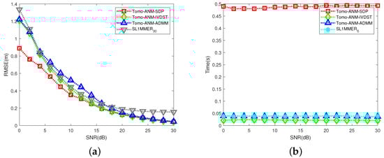 Figure 17a displays the location accuracy of Tomo-ANM-IVDST and Tomo-ANM-ADMM, with Tomo-ANM-SDP and SL1MMER as a contrast. When 10 dB, the position accuracy of Tomo-ANM-IVDST is slightly better (0.02 m lower for dB) than that of the on-grid algorithm SL1MMER. When 10 dB, the accuracy of Tomo-ANM-IVDST gradually becomes better than SL1MMER and is close to that of Tomo-ANM-SDP. The RMSE values of Tomo-ANM-IVDST and Tomo-ANM-SDP are the same, 0.04 m, when dB. For Tomo-ANM-ADMM, the accuracy is superior or close to SL1MMER when 4 dB. When SNR is between 6 dB and 14 dB, the accuracy of Tomo-ANM-ADMM is slightly inferior (0.08 m higher at dB) to SL1MMER. When 20 dB, the accuracy of Tomo-ANM-ADMM is comparable to that of Tomo-ANM-SDP. To sum up, the location accuracy of Tomo-ANM-IVDST is always superior to Tomo-ANM-ADMM. The accuracy of both fast realizations is comparable to Tomo-ANM-SDP at a high SNR. Figure 17b shows the running time of Tomo-ANM-IVDST and Tomo-ANM-ADMM, with Tomo-ANM-SDP and SL1MMER as a reference. As we can see, both algorithms can significantly reduce running time relative to Tomo-ANM-SDP. The time consumption of Tomo-ANM-ADMM (0.04 s on average) is equivalent to that of SL1MMER, while Tomo-ANM-IVDST is slightly more effective than SL1MMER. It is worth noting that the time of Tomo-ANM-ADMM is closely related to the parameter setting. In order to obtain reliable results, 30–50 iterations are carried out in this paper.