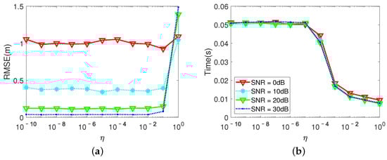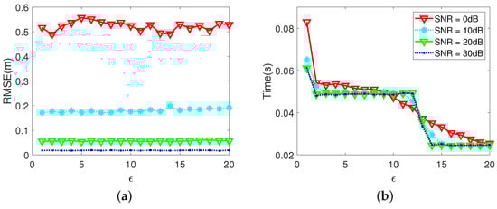 The stopping criterion is a predefined precision of the residual , where i represents iteration times. To better illustrate the impact of the change in , we set so that it changes from to . In practice, is usually not set because reliable results cannot be obtained. The results of the RMSE and time consumption are shown in Figure 20a,b. As we can see, when , the accuracy of Tomo-ANM-IVDST under different SNRs performs well and does not change very much. However, there is a large increase (from to 1.49 m at dB) when increases from to . Looser stop criterions lead to lower positioning accuracy. In Figure 20b, time consumption at different SNRs is almost the same. Time decreases from to 0.01 s while changes from to at 30 dB. A sudden decrease (from to 0.01 s) occurs when increases from to at 30 dB, which means looser stop criterions can be achieved with fewer iterations. Note that the number of iterations reaches the maximum we set when , so the running time is limited. It actually takes longer to reach the stop criterion. Combined with the accuracy performance, can be selected for a higher accuracy obtained in a shorter time. In this paper, can be or . The choice of needs to be determined after many attempts.