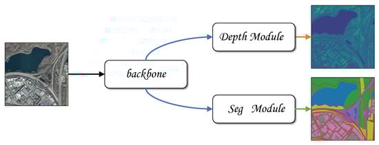 In remote sensing, Srivastava et al. [] combined semantic segmentation and nDSM (normalization DSM) prediction of the corresponding region to build a multi-task learning network. In this structure, multiple tasks share a backbone network and finally use the full connection layer to realize task decoupling. The multi-task architecture proposed by Carvalho et al. [] tends to split between two task-specific branches. For tasks such as semantic mapping and nDSM regression, the model effect is much better than the previous multi-task model. Benjamin et al. [] used a single aerial image to construct a multi-task learning model to complete regional semantic segmentation and distance estimation. Experiments show that the introduction of multi-task learning can effectively help segment tasks. Compared with these, our multi-task model hopes to use the category information of semantic segmentation to optimize the regression of nDSM, which is a more appropriate design pattern.