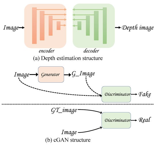 As shown in Figure 3a, monocular depth estimation uses a neural network structure similar to U-Net []. Encoder continuously reduces the size of the feature map by using convolution operation. However, for the final decoder to generate a depth map with more low-level and high-level information about the original image, it uses jump connection and other operations. In the whole neural network structure, the basic characteristics of convolution are utilized to obtain a larger receptive field by reducing the size of the feature graph so that more global information can be obtained in the deeper layers of the network. In contrast, more local information can be obtained in the shallow layers. For the decoder, local feature information and global feature information extracted by Encoder are used to increase the size of the feature graph step by step through deconvolution, and finally, mean-square error loss is constructed with a real depth map to realize model parameter updates. The model loss function is as follows: