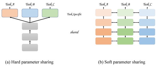 From the perspective of methodology, the current mainstream multi-task learning can be divided into Hard Parameter Sharing and Soft Parameter Sharing, as shown in Figure 5. For hard parameter sharing, the model shares some parameters among all tasks and uses its unique parameters in particular tasks. Obviously, in this model, the model is challenging to fit, and the sharing layer of the entire network tends to learn feature representation that is better for all tasks. For soft parameter sharing, each task has its parameters. Finally, the overall multi-task learning can be carried out by combining the differences between the parameters of different tasks. Compared with hard parameter sharing, soft parameter sharing has the following advantages: