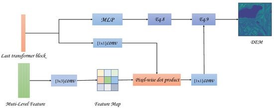 In our paper, inspired by Adabins [], we transform the depth estimation problem from regression to a classification problem, which is beneficial for us to perform semantic segmentation tasks simultaneously. In previous research on relative height and depth estimation, most of the problems were attributed to regression or generation problems, such as GAN [,]. For regression, the encoder–decoder structure is mostly used to make the model fit the actual data distribution as much as possible, as shown in Figure 6. However, this model generates depth or relative height with a more or less negligible ladder effect and therefore does not produce a more realistic looking depth map. As shown in Figure 9, we designed a method to use multi-level semantic information and feature information of the last layer to generate relative height.