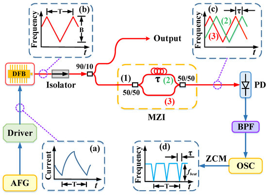 The schematic of implementing the DFB-LD linearly frequency-swept is shown in Figure 1. The drive current waveform obtained by the iterative pre-distortion algorithm that makes the DFB-LD linearly frequency swept is pre-input into the arbitrary function generator (AFG), and the drive module of the DFB-LD is synchronized with the AFG, the pre-distortion current that is injected into the DFB-LD is shown in Figure 1a. Under this current drive, the DFB-LD outputs the frequency swept light wave of the cycle, and its time-frequency curve is shown in Figure 1b. After passing through the isolator, the frequency swept light wave is divided into two beams by a 90:10 coupler. 90% of the light wave is output directly, and the other 10% is sent to an unbalanced fiber optic Mach-Zehnder interferometer (MZI) to generate autocorrelation external differential interference, and the time-frequency curves of the two-frequency swept light waves with differential time delay τ are shown in Figure 1c. The photodetector (PD) converts the two coherently superimposed light waves into electrical signals, which are acquired by an oscilloscope (OSC) after passing through a band-pass filter (BPF), and the time-frequency curves of the MZI beat signals are obtained by the zero-crossing method (ZCM) (see Figure 1d).