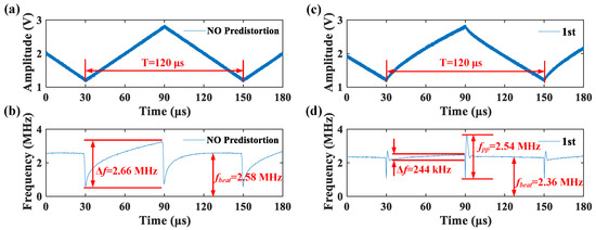 When the no pre-distortion triangular waveform shown in Figure 3a is injected into the drive module of the DFB-LD, the time-frequency curve of the beat signal at the MZI output will deviate from the ideal constant frequency. As shown in Figure 3b, the time-frequency curve varies slowly with time over a wide bandwidth ∆f (2.66 MHz). This indicates that the frequency of the DFB-LD is not linear with time; this conclusion is also verified later in Figure 5a.
