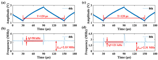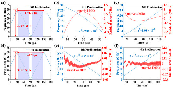 In order to calculate the time frequency curve of the frequency swept light wave output by the DFB-LD under current drive, we extract the phase of the beat frequency signal by Hilbert transform (HT). 40-period beat signal of the MZI output obtained from the OSC are used to obtain the time frequency curve of the frequency swept light wave by direct calculation of Equation (10); Figure 5a,d, respectively. Figure 5a,d shows the frequency swept results of the laser output light wave driven by the no pre-distortion triangular waveform voltage and the 4th pre-distortion voltage, respectively. Figure 5a,d show the frequency swept light wave of 180 us, which contains a complete frequency swept process. As shown in Figure 5a, the frequency swept waveform has a large nonlinearity under the no-predistortion triangular voltage drive, especially in the initial part where the frequency swept slope is flipped, and the frequency swept bandwidth is 29.47 GHz. As shown in Figure 5d, the frequency swept nonlinearity has been corrected more under the fourth-order predistortion voltage drive, and the frequency swept bandwidth is increased to 30.26 GHz.